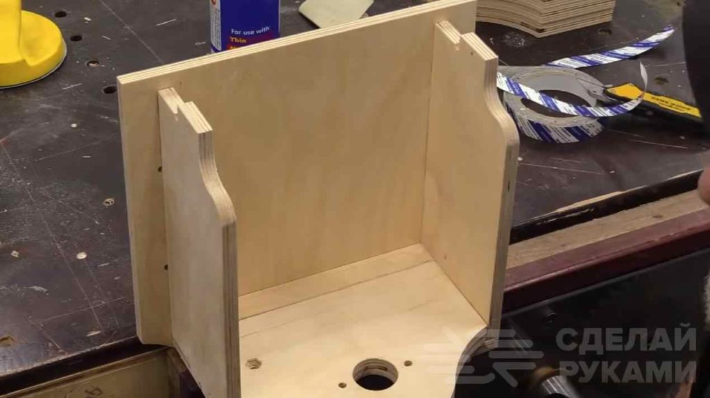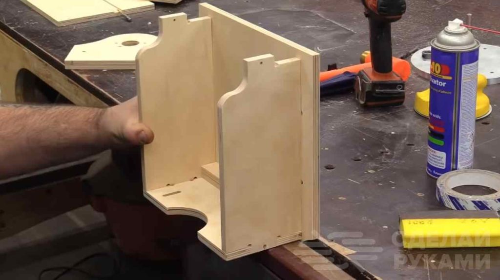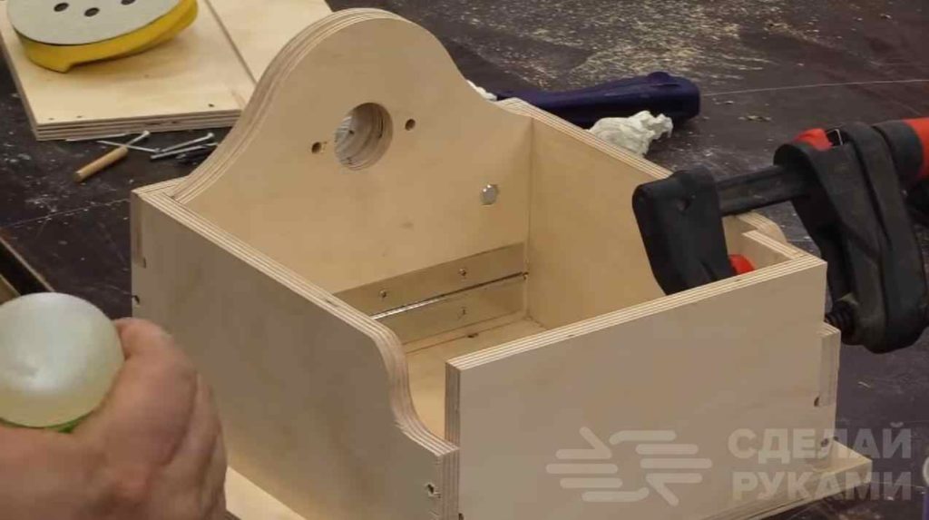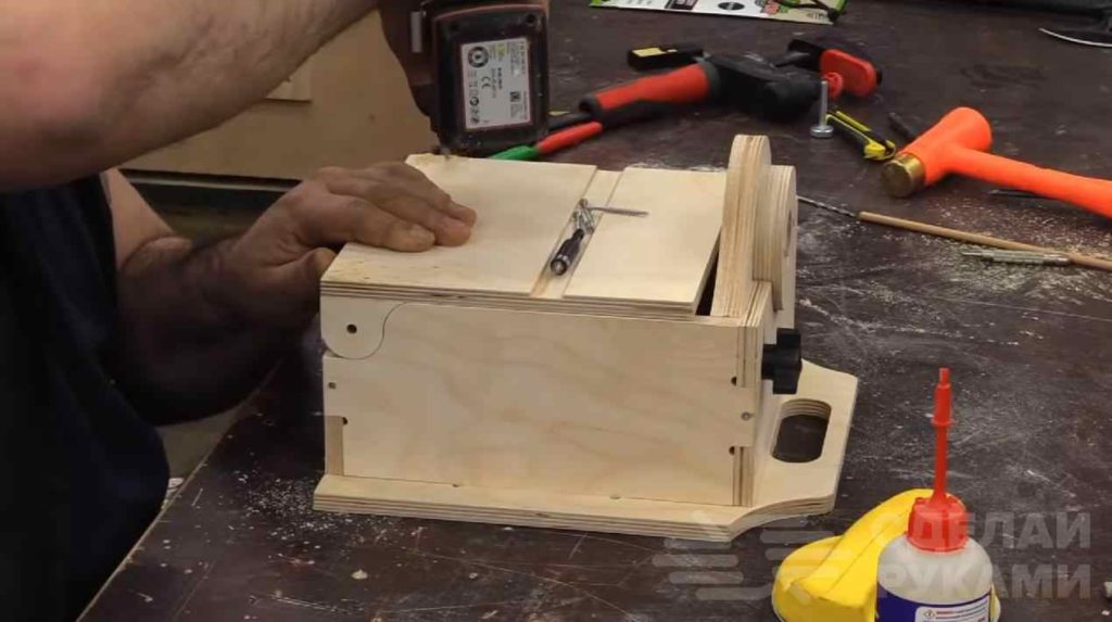 Вторая промежуточная стенка крепится к закрепленному изнутри бруску из фанеры при помощи рояльной петли, и является откидной — то есть складывается внутрь корпуса. Далее мастер крепит переднюю стенку.