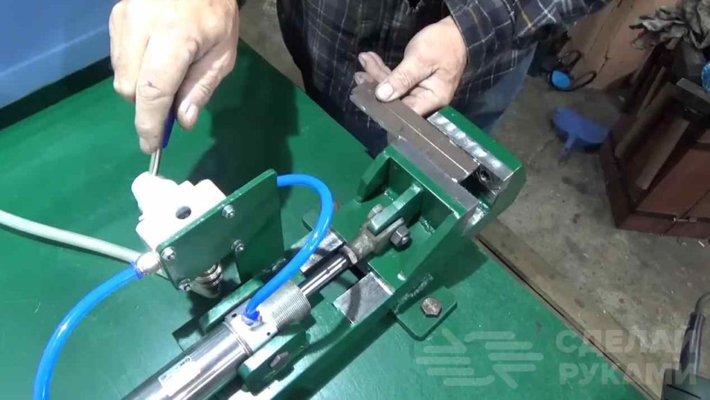 После этого останется только установить и подключить блок пневмораспределителя. На нем имеется ручка, при повороте которой обеспечивается доступ сжатого воздуха из пневмосети в пневмоцилиндр.
