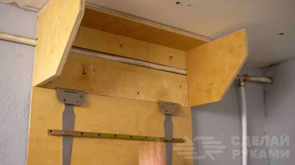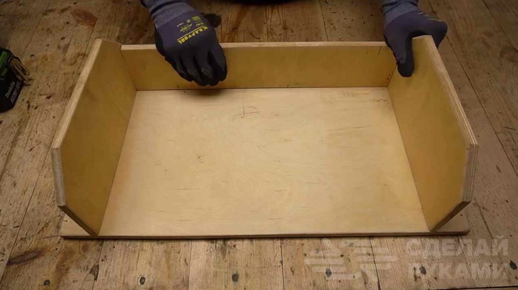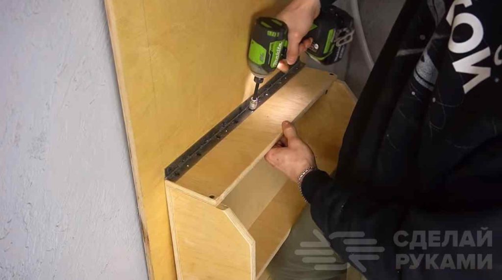 Далее крепим лист фанеры к верхнему коробу. К этому листу крепятся ящики, которые также изготовлены из фанеры.