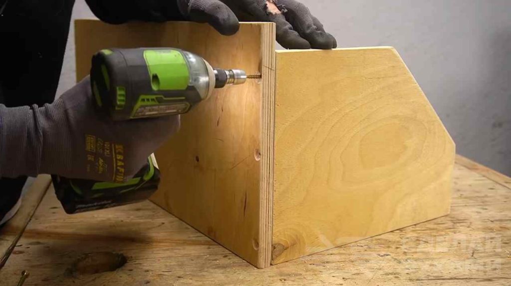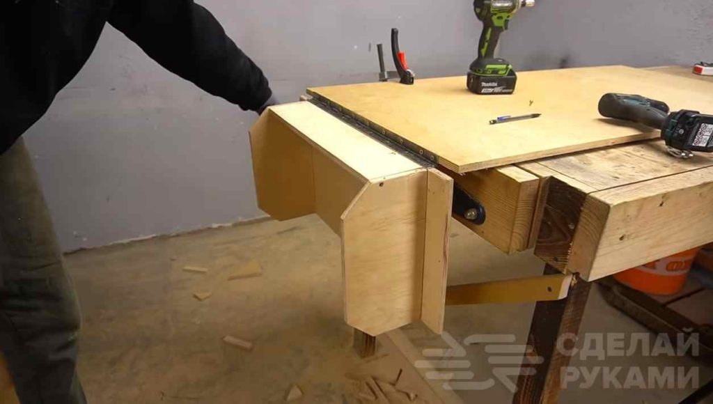 После этого делаем нижнюю часть, которая одновременно является и ящиком для инструмента, и прикручиваем к ней лист фанеры. Для этого мастер использует кусок рояльной петли.