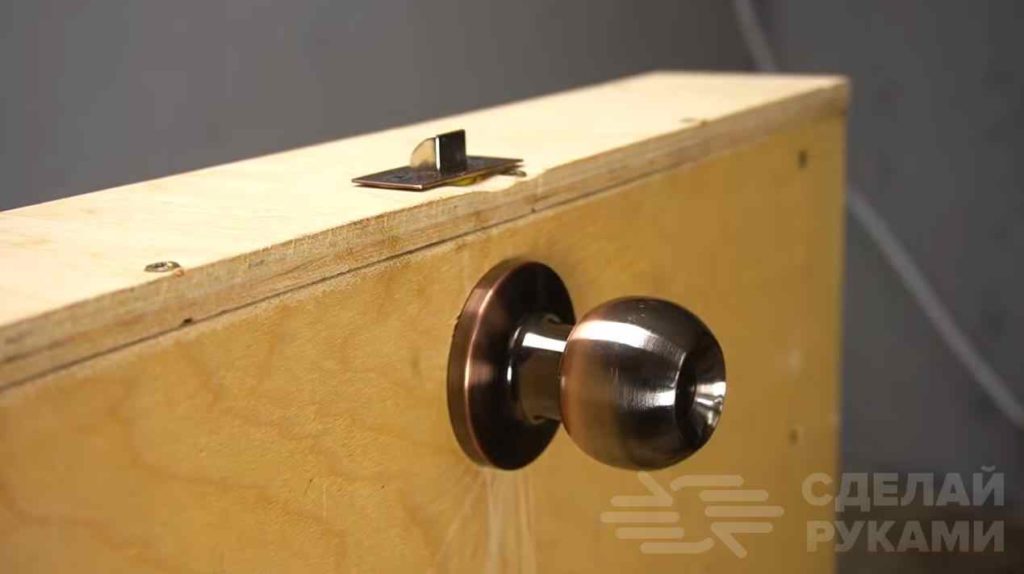 На следующем этапе к листу фанеры нужно будет прикрутить еще несколько рояльных петель и две накладные петли. Также автор устанавливает ручку-защелку в нижнем ящике.