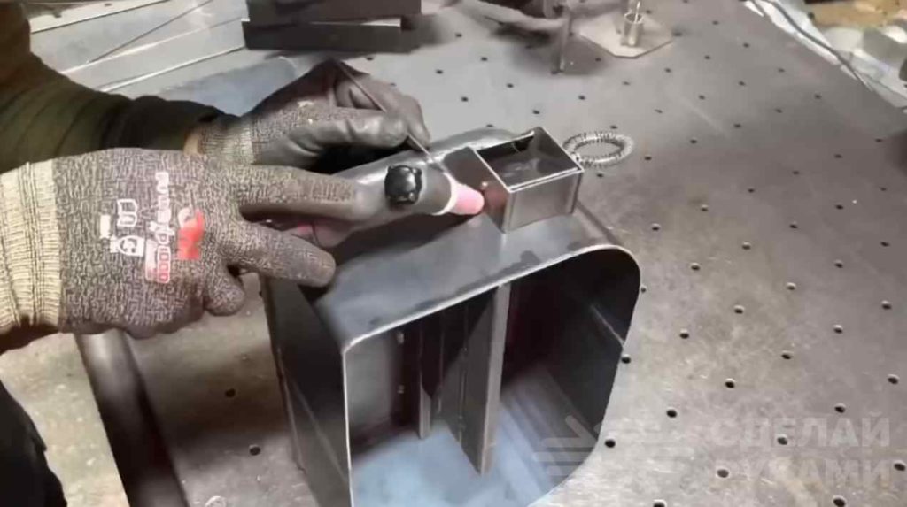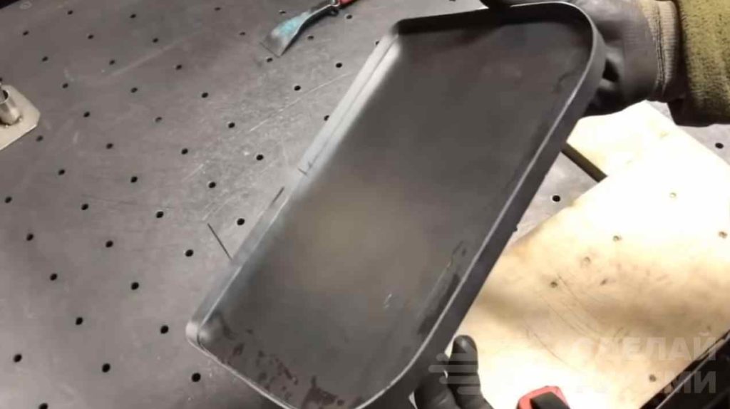 Далее необходимо вырезать из листового металла две широких полосы и согнуть из по форме ранее вырезанной пластины. Подгоняем эти две заготовки, и потом привариваем.