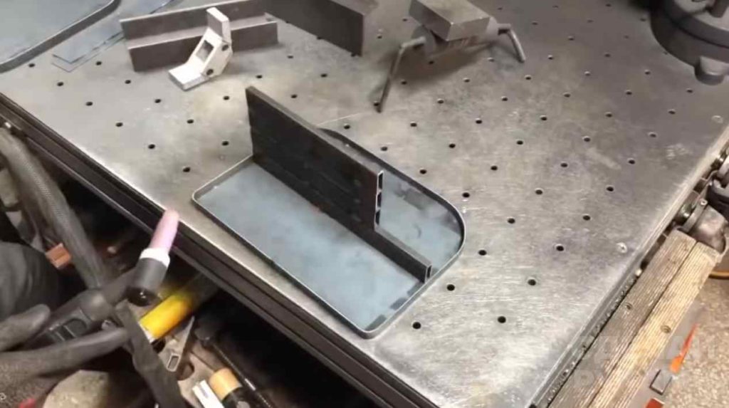После этого отрезаем заготовки из прямоугольной профильной трубы. Свариваем их вместе, и привариваем к металлической пластине.