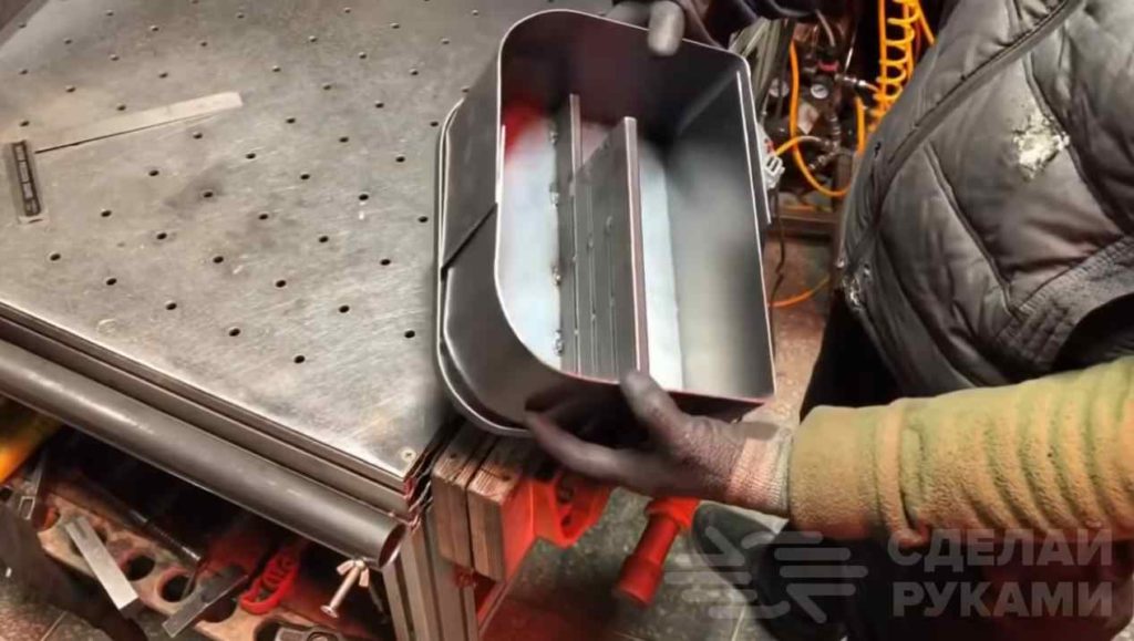 Последний этап — зачистка сварных швов и покраска. Внутрь чемоданчика мастер укладывает дымоходные трубы и ножки. Для удобства транспортировки останется еще сделать ручку.