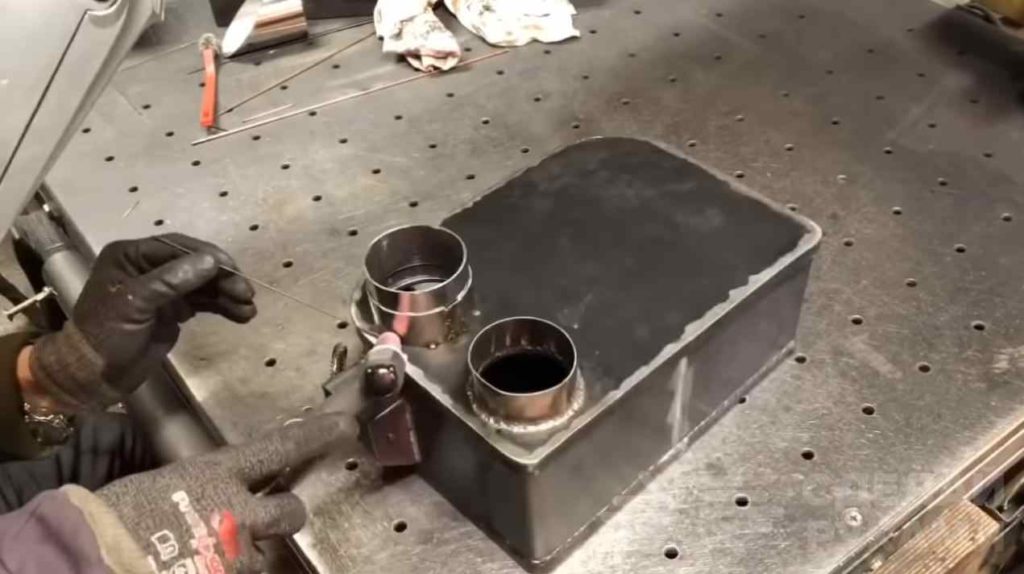 В нижней части корпуса сверлим четыре отверстия и привариваем гайки, в которые будут вкручиваться ножки. В крышке печи вырезаем круглые отверстия и ввариваем кольца.