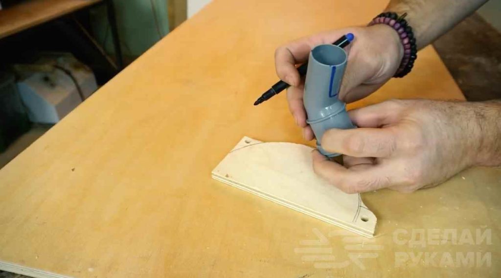 Первым делом вырезаем кусок фанеры необходимой формы. Далее делаем разметку на пластиковом отводе для канализации.