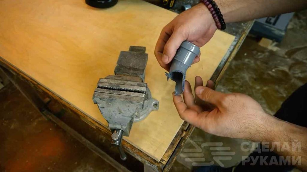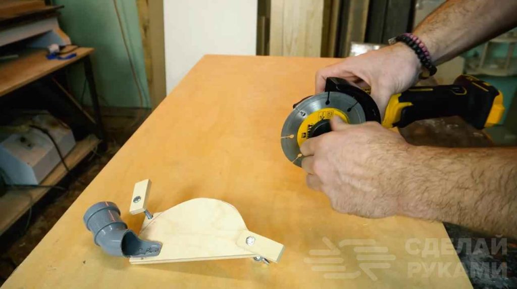 Дальше все просто: надеваем на болгарку родной защитный кожух и устанавливаем диск по бетону. К ранее вырезанной заготовке из фанеры крепим кусок пластикового отвода.