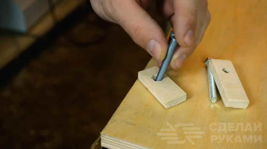 На следующем этапе нужно будет сделать фиксаторы. Для этого отрезаем два куска фанеры и сверлим в них отверстия под болты. Отверстия такого же диаметра нужно просверлить в первой заготовке.