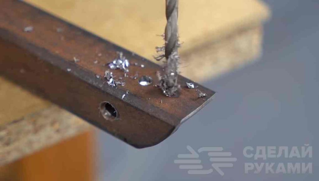 Первым делом нужно отрезать два куска профиля. На конце одной из заготовок автор срезает часть стенок под углом и делает закругление. Потом нужно будет просверлить отверстия.