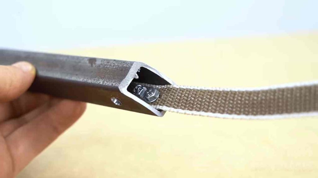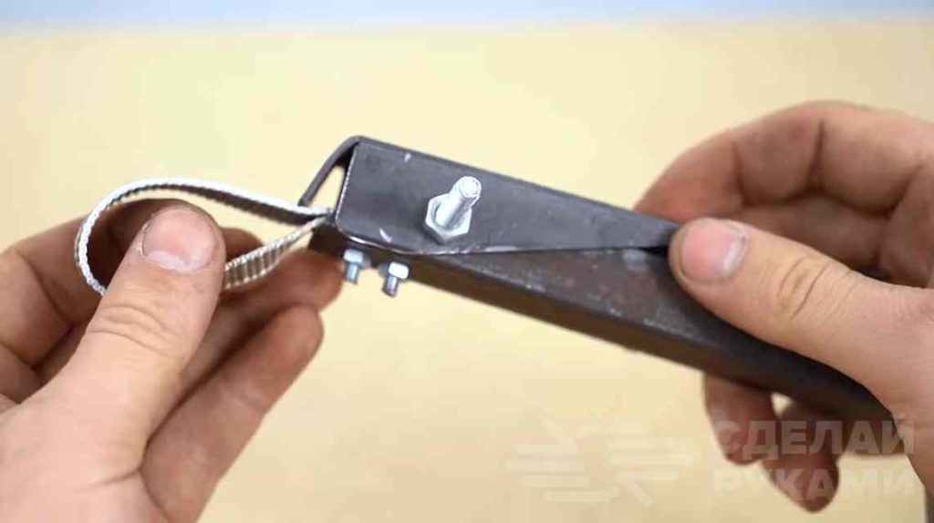 На следующем этапе автор отрезает необходимую длину ремешка, прожигает в нем два отверстия и крепит к первой заготовке при помощи болтов с шайбами и гайками.