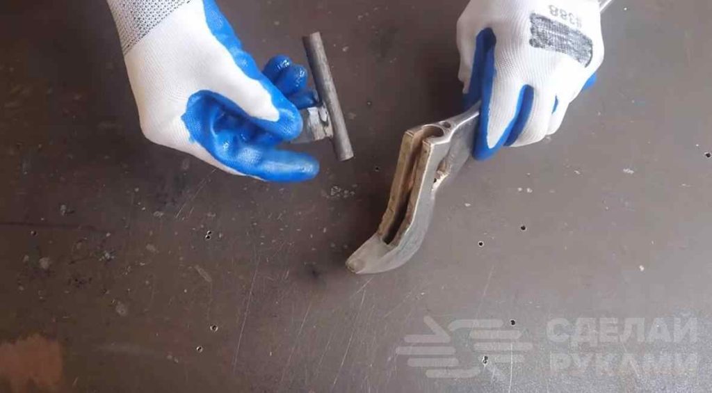 К эксцентрику необходимо приварить ручку из круглого стального стержня. Потом сварной шов надо будет зачистить болгаркой.