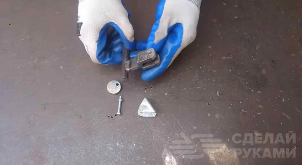 Далее нужно будет вырезать из профильной трубы прижим, а из отрезка кругляка — эксцентрик. Сверлим в этих деталях отверстия, после чего при помощи болта и гайки крепим к первой детали.
