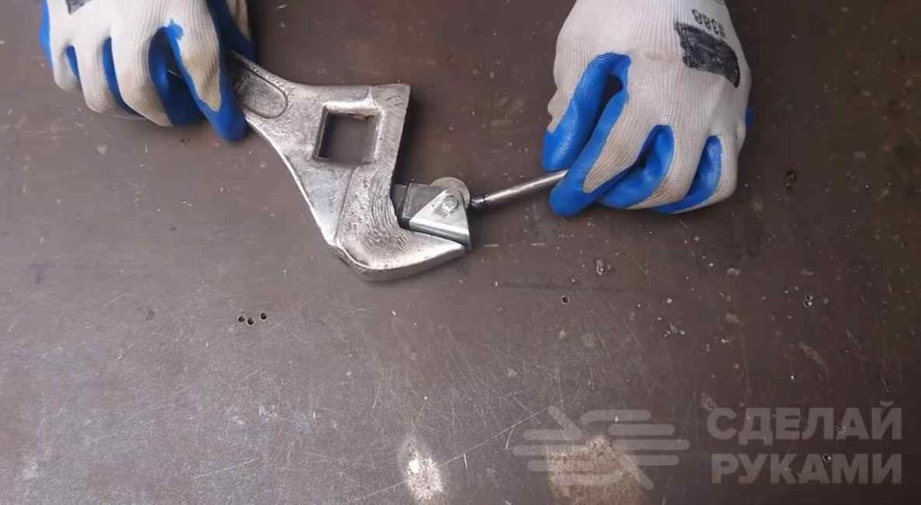 Далее вставляем прижим в разводной ключ и привариваем кусок металла к торцу отверстия, чтобы деталь не выпадала. Самоделка готова.