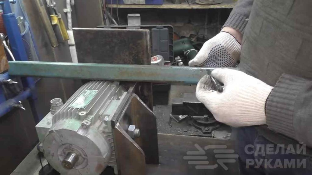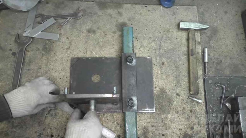 Кусок швеллера привариваем к основанию. Затем к швеллеру автор приваривает площадку для электродвигателя и боковую стенку (из кусков металла толщиной 10 мм).