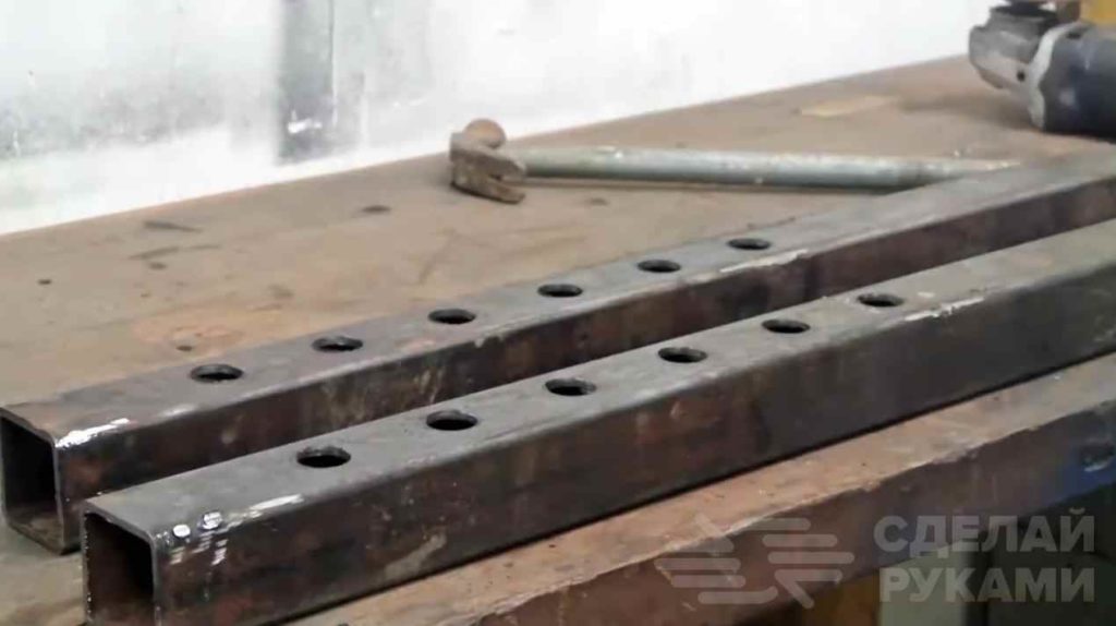 Первым делом отрезаем четыре отрезка профильной трубы: два длинных (стойки) и два коротких. В стойках сверлим отверстия. Потом свариваем заготовки вместе.