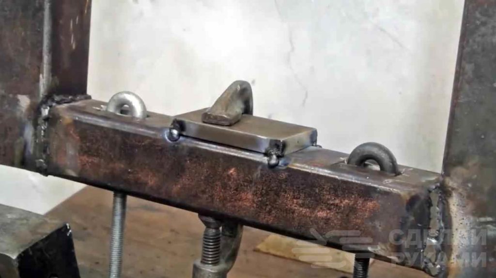 К внутренней стороне верхней части рамы привариваем рым-болты, к которым будут крепиться две пружины, и толстую металлическую пластину — в нее будет упираться шток домкрата.