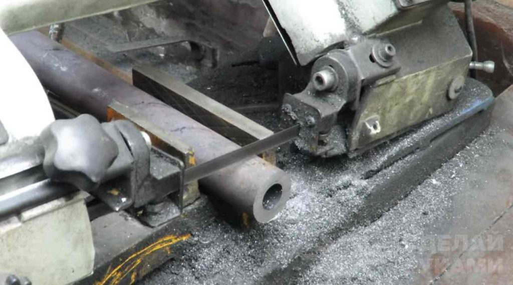 От толстостенной трубы нужно будет отрезать заготовку шириной 25 мм. Удобнее всего сделать это на ленточной пиле.