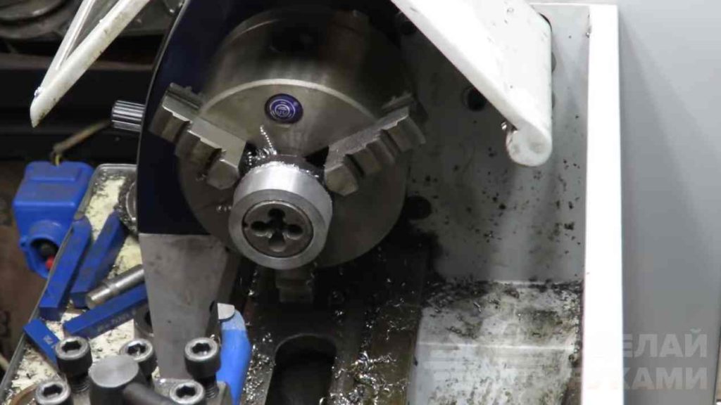 Далее на токарном станке автор растачивает в заготовке отверстие, чтобы оно подходило под наружный диаметр плашки.