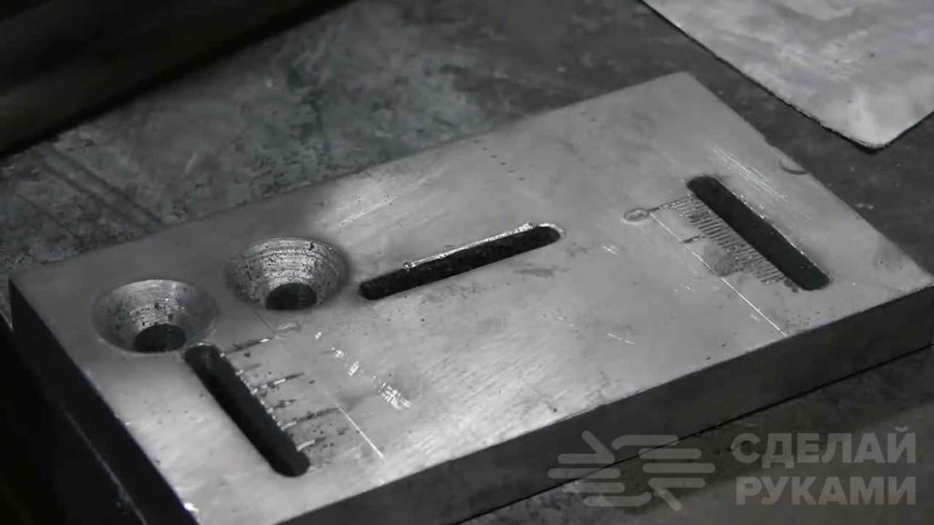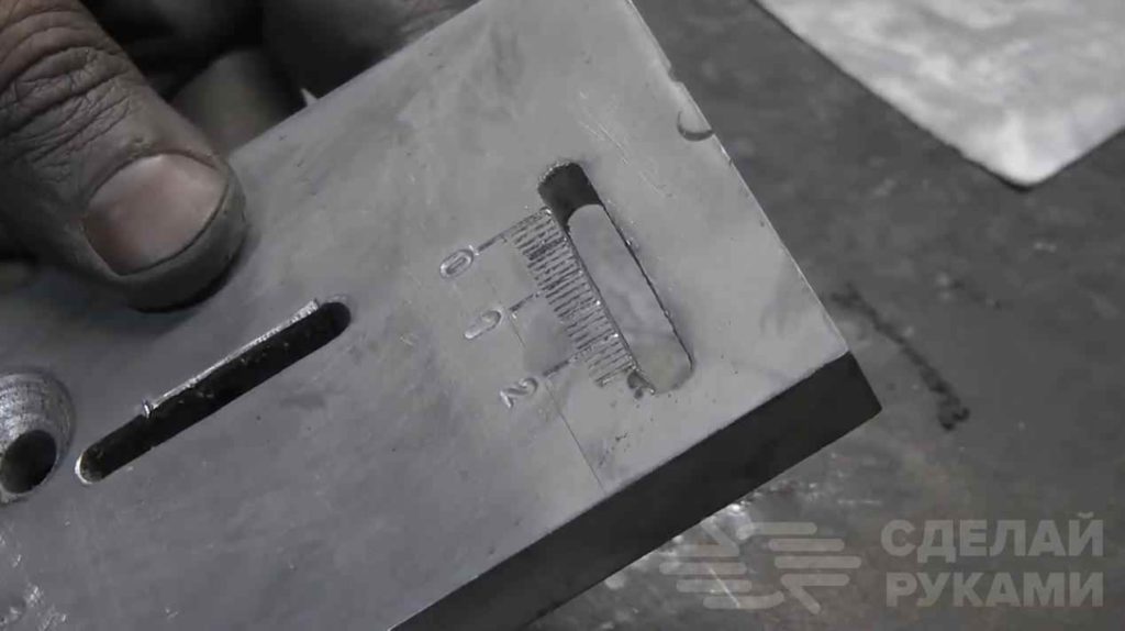 В основании выбираем пазы для параллельного упора и режущего ножа, а также сверлим крепежные отверстия. Для удобства автор сделал шкалу измерения.