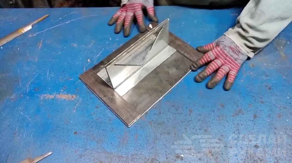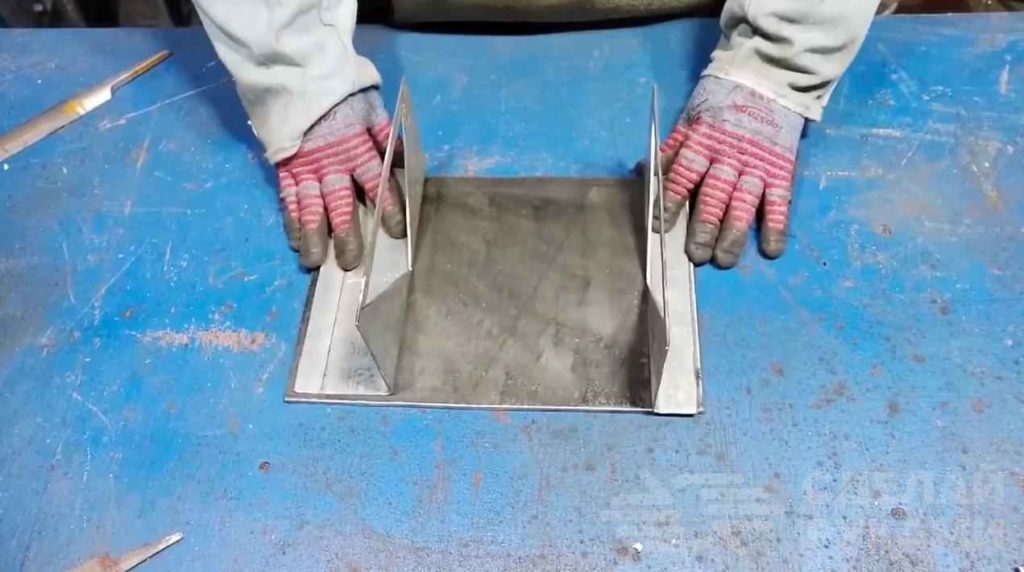 В качестве основания автор использует кусок листового металла толщиной 3-4 мм (размеры заготовки: 200х280 мм). Также потребуется две полосы металла и две части от квадратной профтрубы.