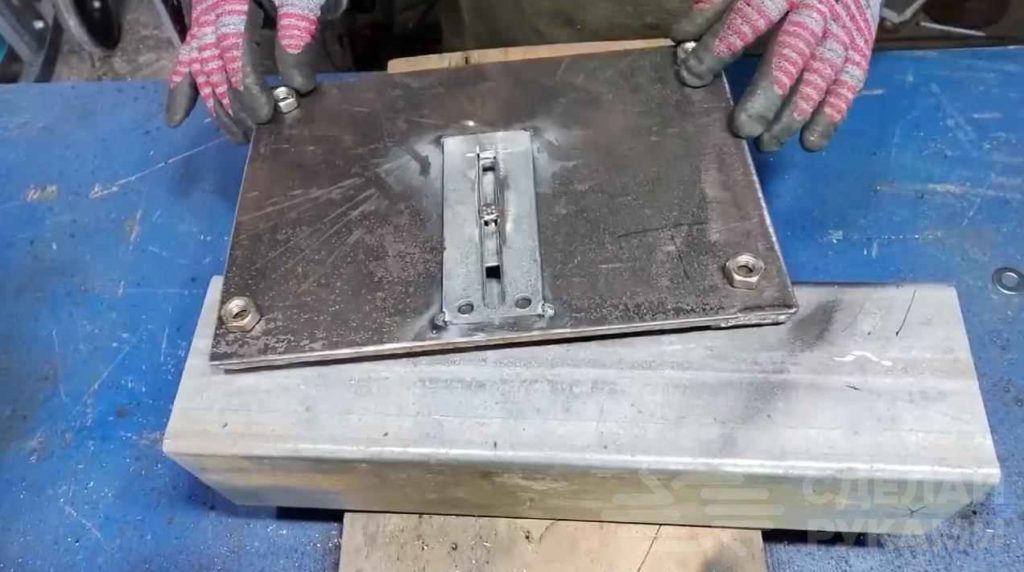 Вторая — подвижная. Она крепится с помощью болта с гайкой. Предварительно в основании нужно вырезать паз. По краям основания автор приваривает ограничители из металлической полосы.