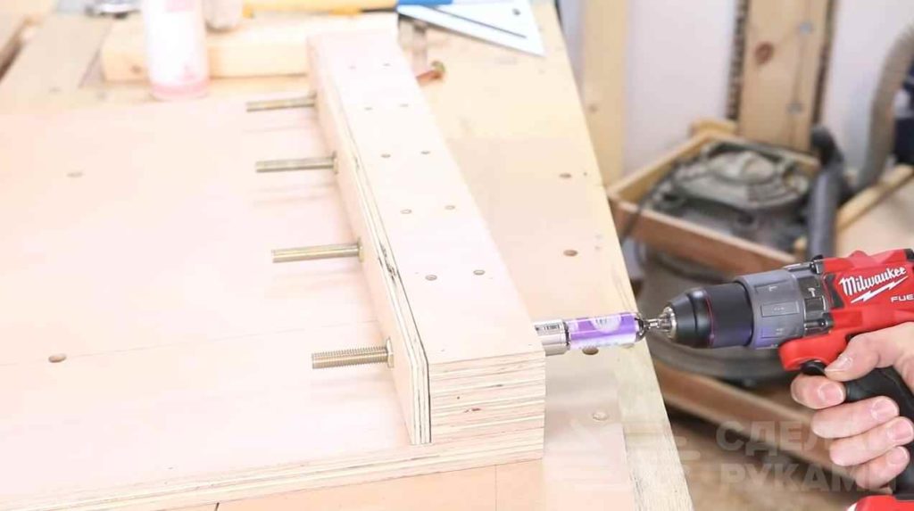 В первом бруске сверлим направляющие отверстия. Затем приклеиваем к нему полосу фанеру с отверстиями и запрессованными в них гайками. Вкручиваем болты.