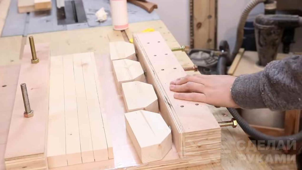 После этого из фанеры нужно отрезать полосы, из которых будем склеивать два бруска: упорную планку и блок с направляющими отверстиями для болтов с прижимными губками.