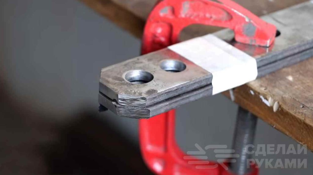 Первым делом необходимо будет просверлить по разметке отверстия в полосах металла. С одной из сторон углы заготовок обрезаем. В эти отверстия будут вставляться фиксирующие болты.