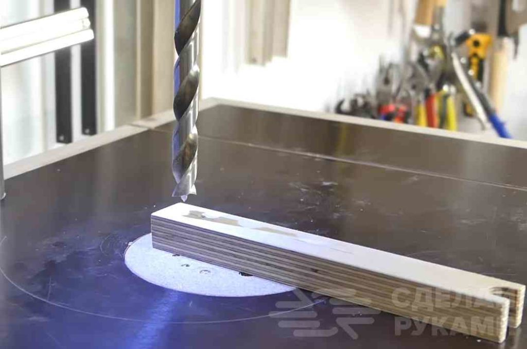 Далее на торце заготовки мастер делает полукруглый паз, а на другой стороне — сверлит отверстие под карандаш.