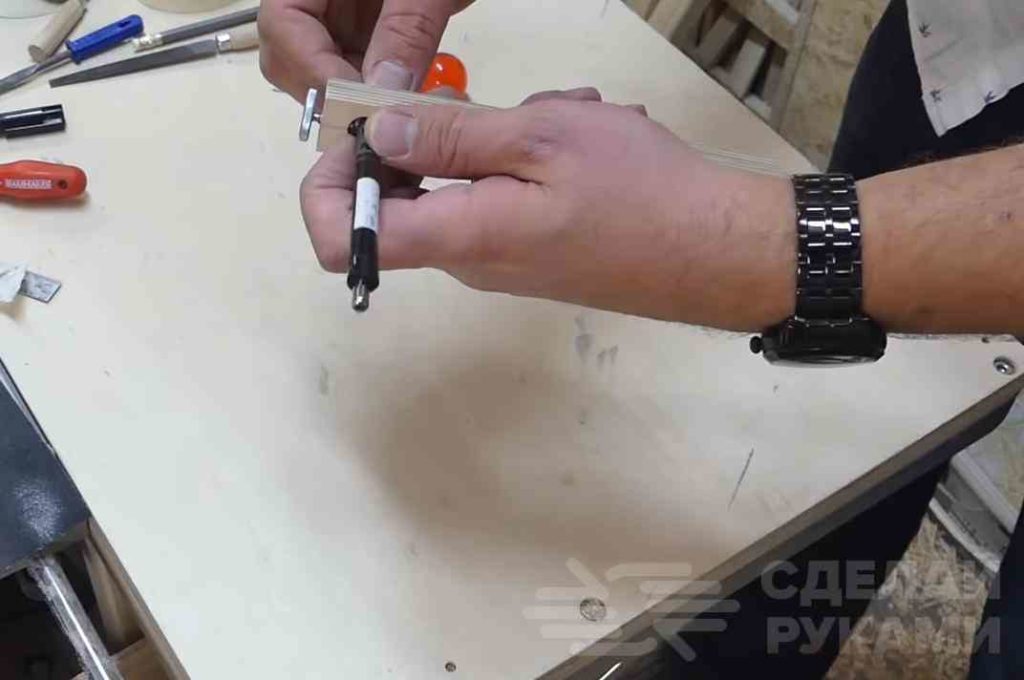 На следующем этапе необходимо изготовить фиксирующий болт, который будет фиксировать карандаш. Кстати, большое отверстие позволяет установить также ручку или маркер.