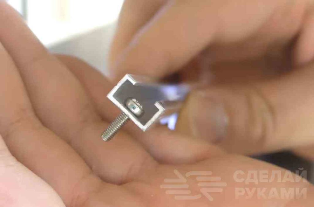 В алюминиевом профиле автор сверлит отверстие и нарезает в нем резьбу. В это отверстие вкручиваем винтик. Конец метиза нужно заточить на наждачном станке или с помощью УШМ.