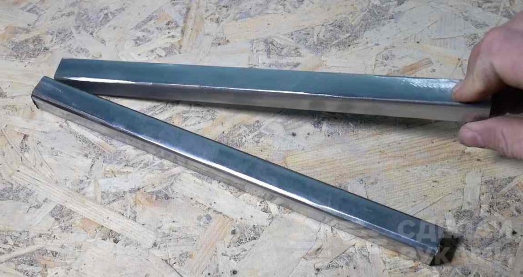 Первым делом отрезаем два куска профильной трубы нужной длины. Сверлим в них по одному отверстию, отступив от одного из краев примерно 10 мм.