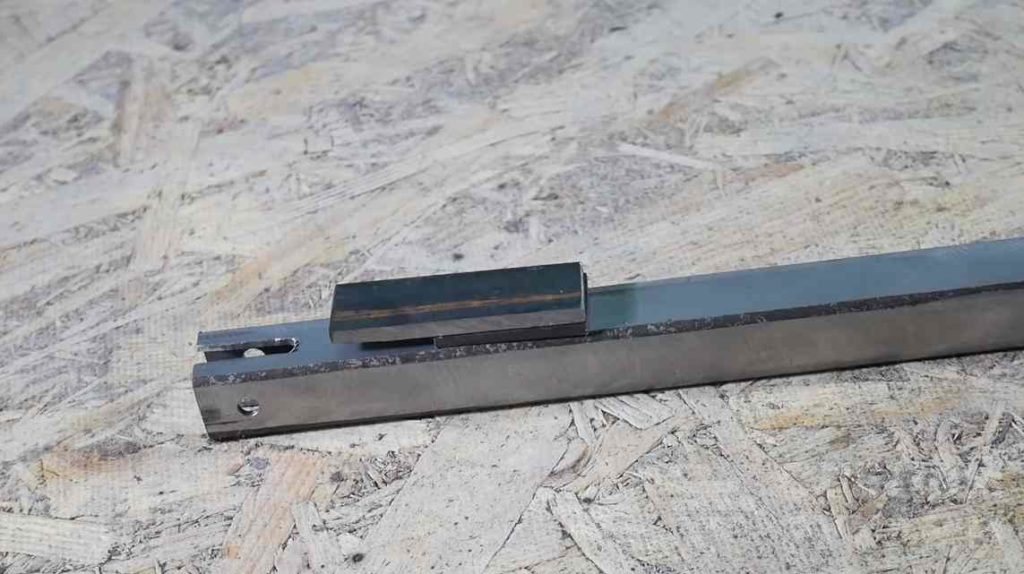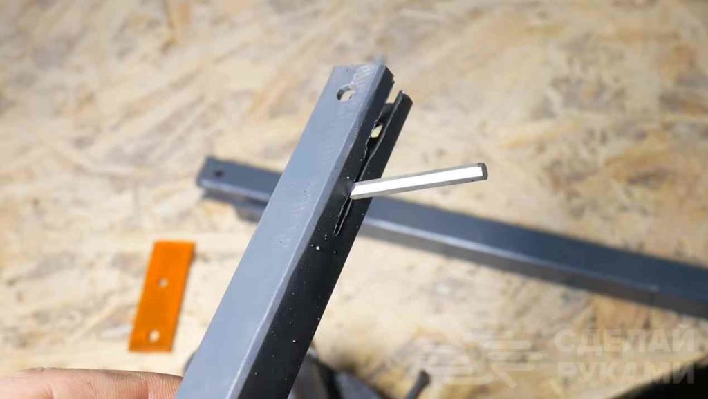 На следующем этапе сверлим отверстие в приваренной длинной полосе металла и делаем продольную прорезь во второй профильной трубе.