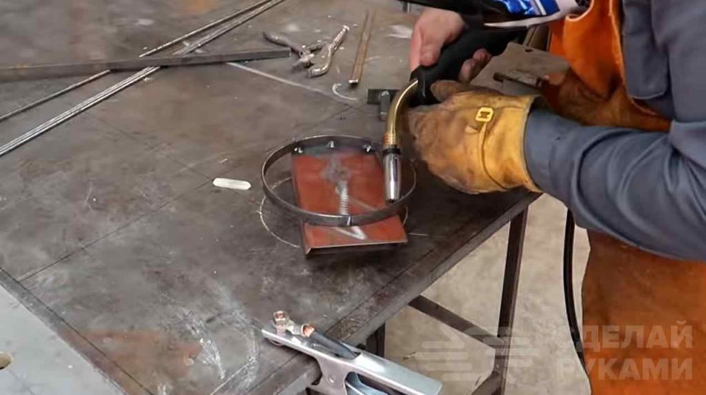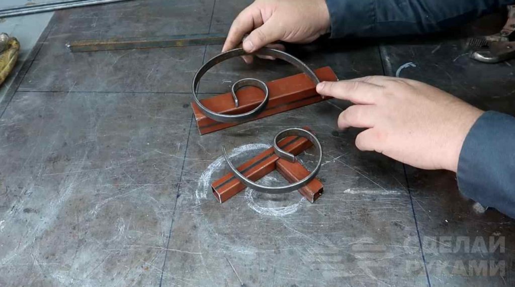 Привариваем завитки к подготовленным отрезкам профильной трубы. Также автор делает кондуктор для изготовления колец. Сгибаем в кольцо полосу металла и привариваем ее к профильной трубе.