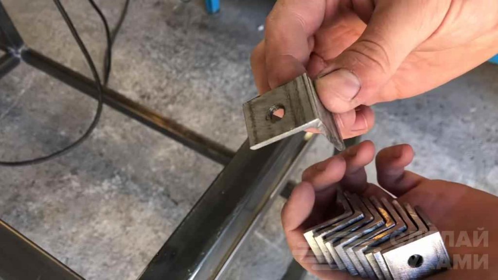 Также надо будет сделать крепление для столешницы — отрезаем кусочки уголка, сверлим в них отверстия, и привариваем к каркасу.