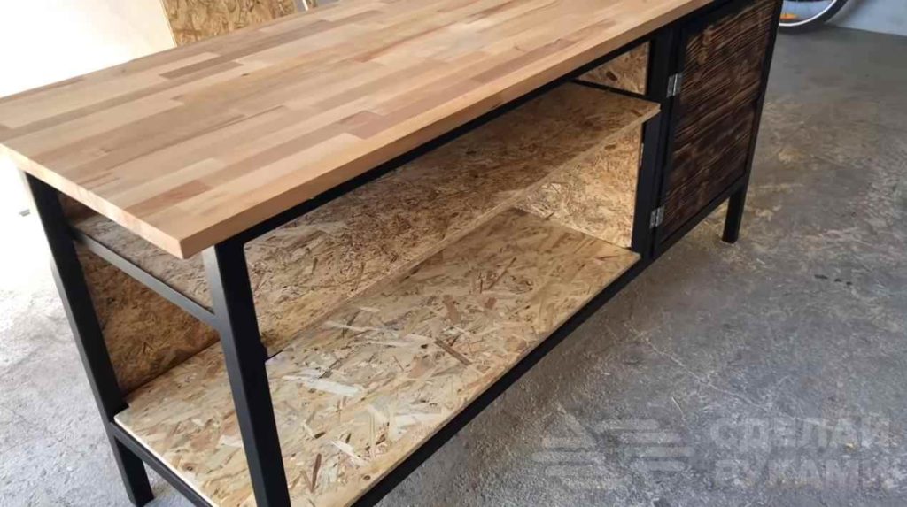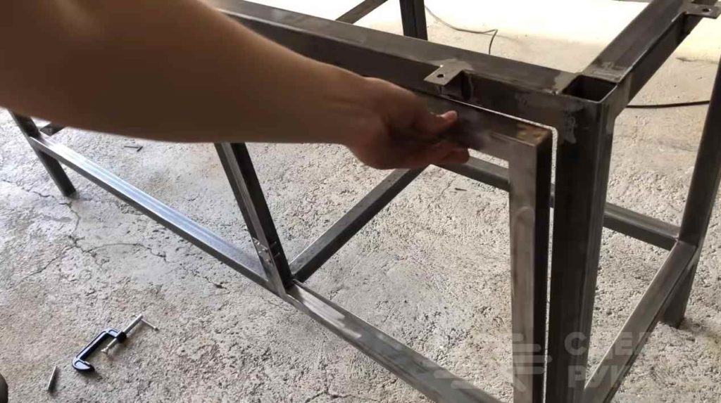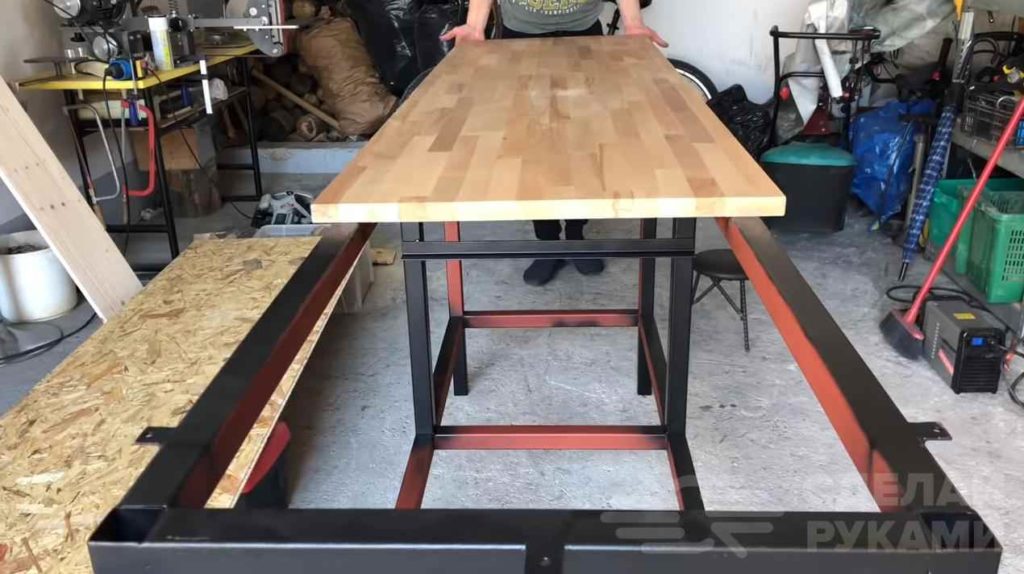 После этого укладываем деревянную столешницу на каркас и прикручиваем на саморезы. Внутри каркаса стола привариваем металлические уголки.