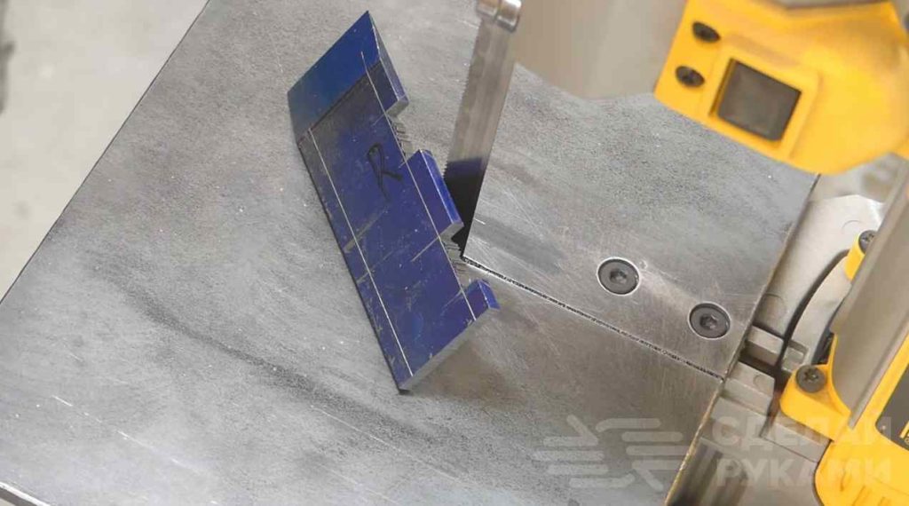 Первым делом возьмём листовую сталь, отрежем от неё два одинаковых куска толщиной 8-10 мм, и разметим её согласно чертежу под соединение «ласточкин хвост». Вырезаем все части и выполняем шлифовальные действия. Это будут стенки рубанка.