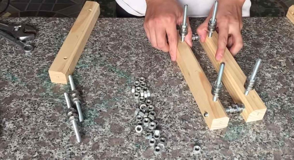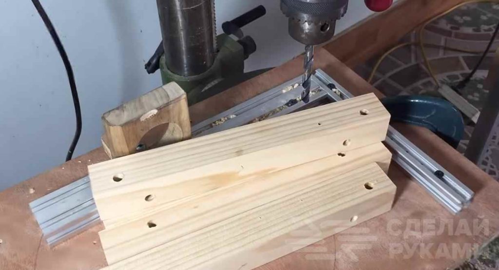 Первым делом отпиливаем четыре деревянных бруска одинаковой длины. По разметке сверлим в них сквозные отверстия.