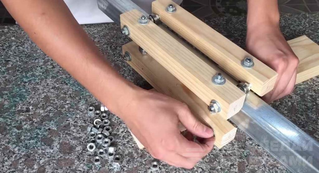 Далее нам потребуются шпильки с гайками и подшипники. Собираем направляющую — между подшипниками будет перемещаться профильная труба квадратного сечения.