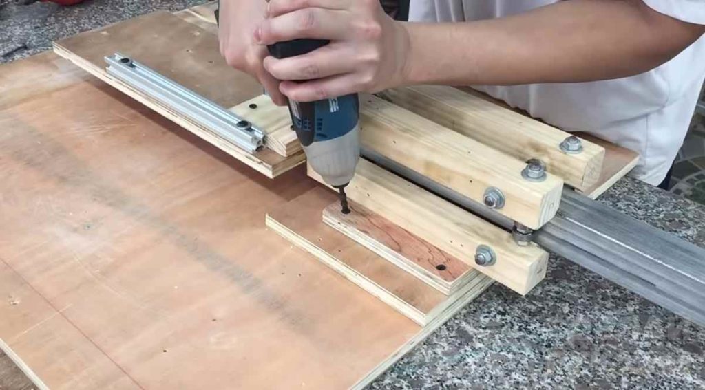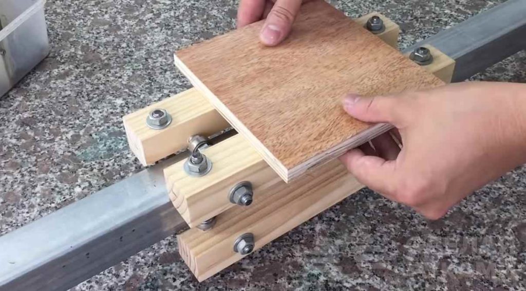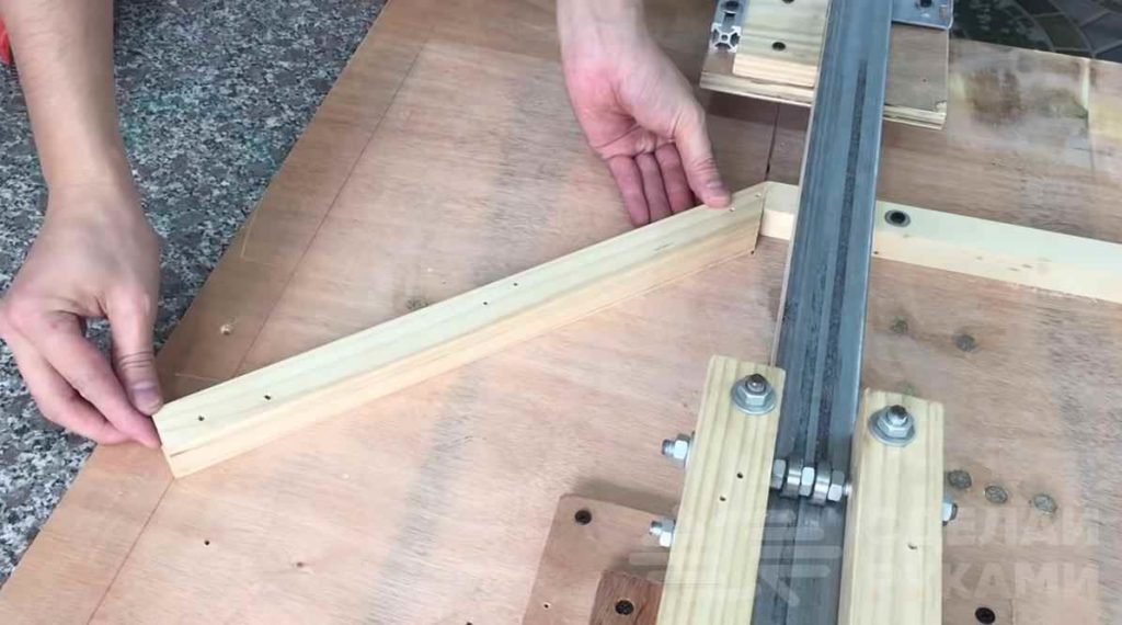 К двум деревянным брускам прикручиваем кусок фанеры (предварительно в нем нужно просверлить отверстия под саморезы).