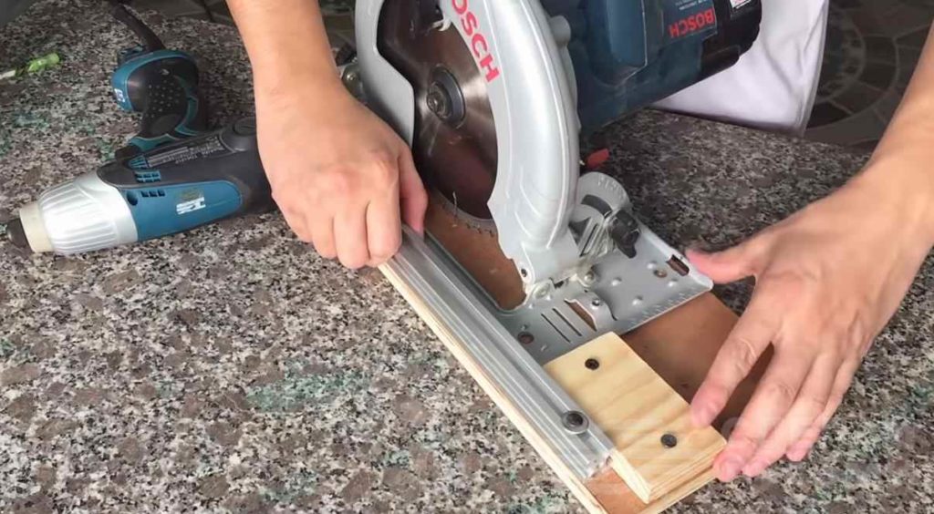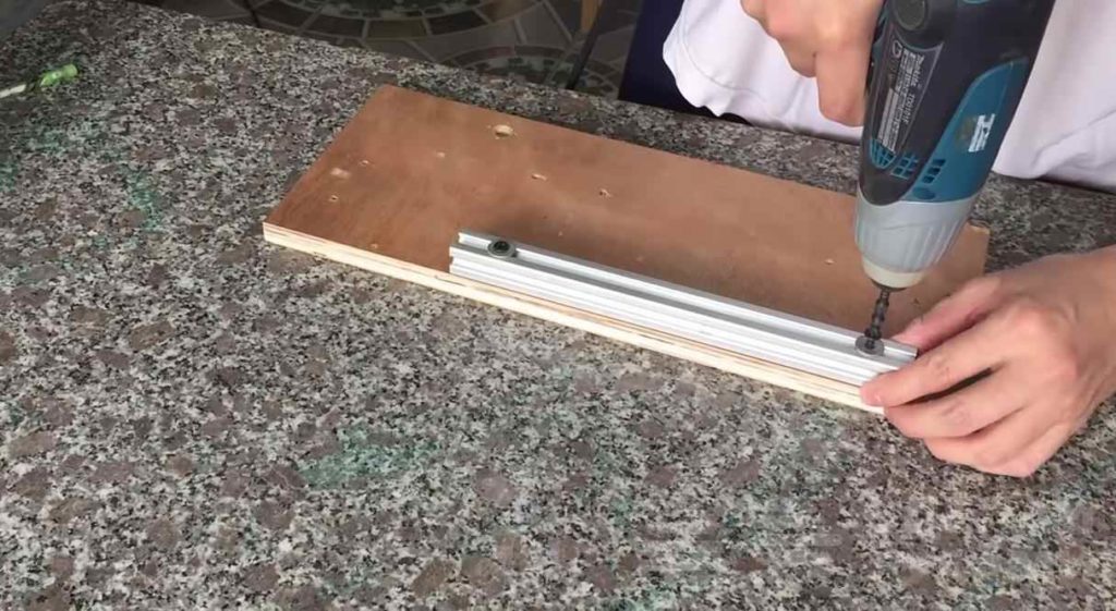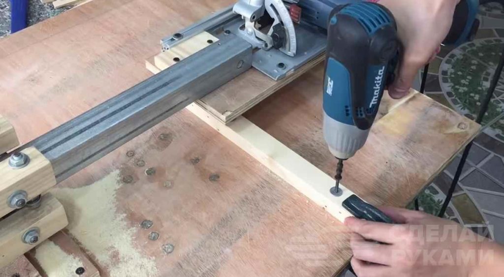 На следующем этапе отрезаем кусок фанеры прямоугольной формы. Прикручиваем к нему направляющую шину для циркулярной пилы. Также нужно прикрутить упор из фанеры.