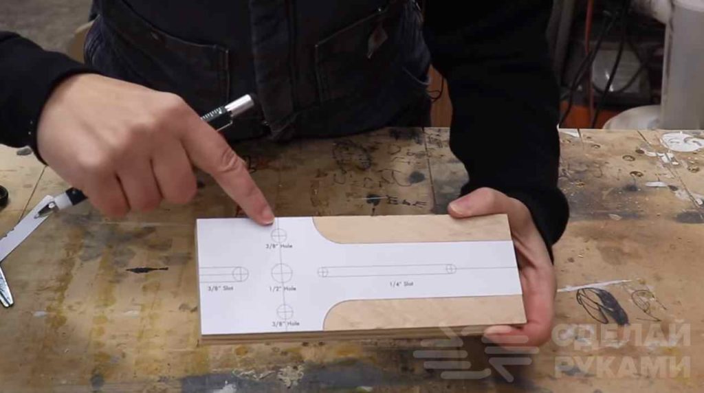 Распечатываем и вырезаем бумажные шаблоны, после чего приклеиваем их к заготовкам. По разметке сверлим отверстия и вырезаем продольные пазы.