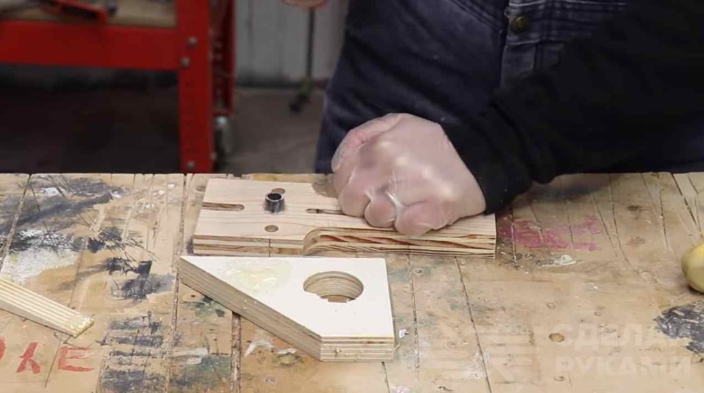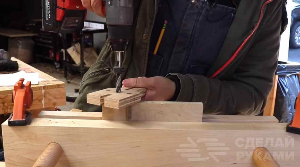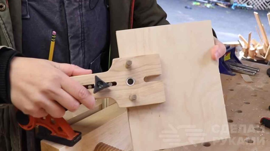 Используя вторую вспомогательную деталь, которая крепится к первой с помощью болта и барашковой гайки, можно регулировать расстояние от края заготовки до места сверления отверстия.