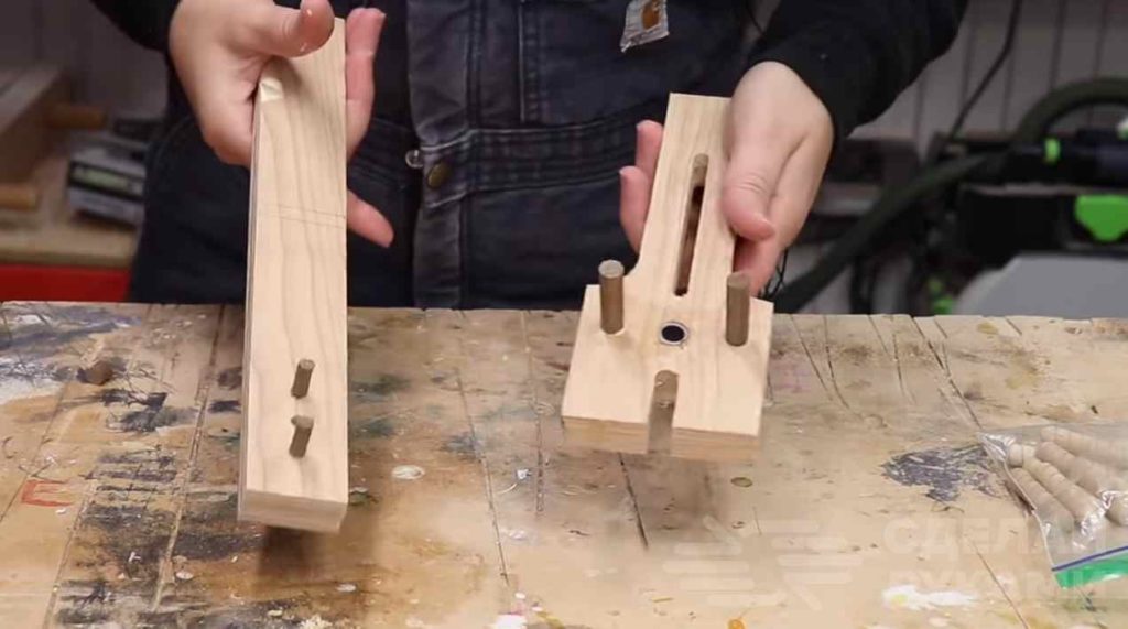 Далее необходимо будет отрезать деревянные шканты — вбиваем их в отверстия в обеих деталях, предварительно смазав столярным клеем ПВА. От второй детали отрезаем лишнюю часть.