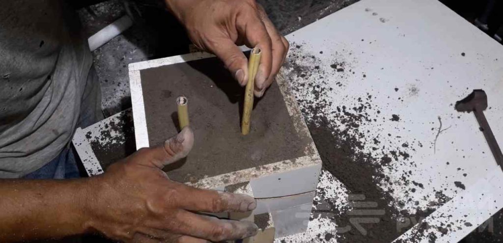 Далее подготовим форму для заливания из пенопласта. Вырезается цилиндрическая заготовка и укладывается в формовочную смесь.