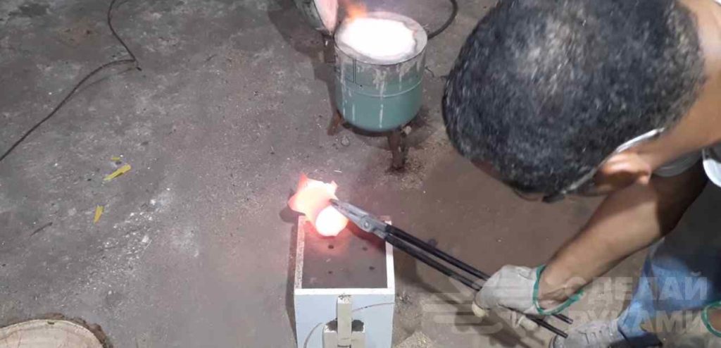 Доводим металл до жидкого состояния и при помощи кузнечного ухвата (щипцов) заливаем расплав в литник. Дождавшись остывания, разбираем опоку и окончательно остужаем заготовку.