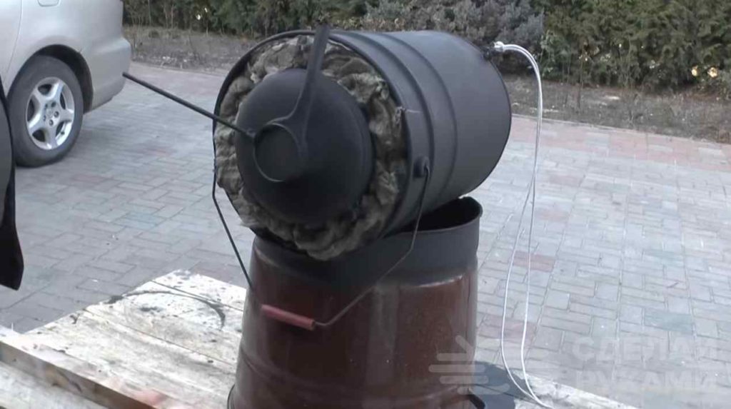 Топка самодельной печи будет изготовлена из старого огнетушителя, а внешняя оболочка — из обычного жестяного ведра.