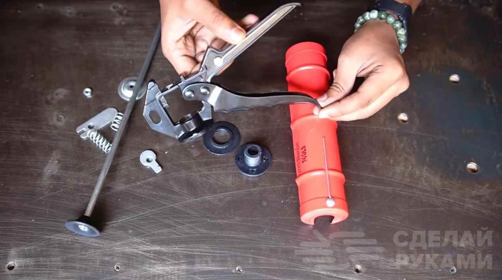 Струбцину для домашней мастерской можно купить, а можно сделать самостоятельно из подручных средств — например, из пистолета для герметика. В данном случае автор использует полукорпусный пистолет.
