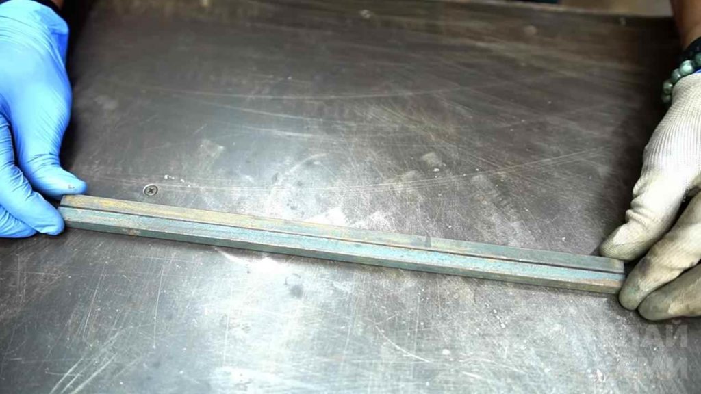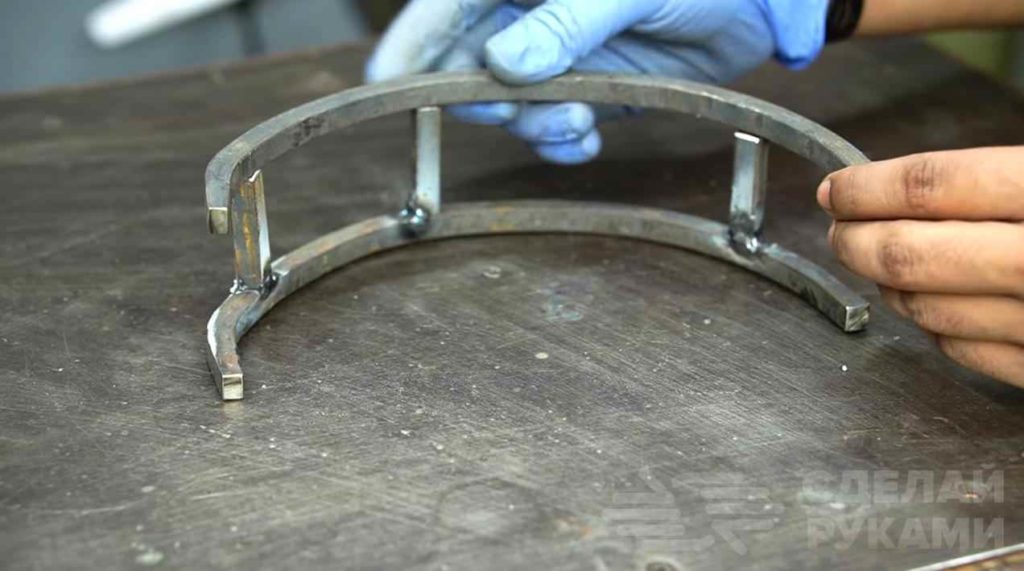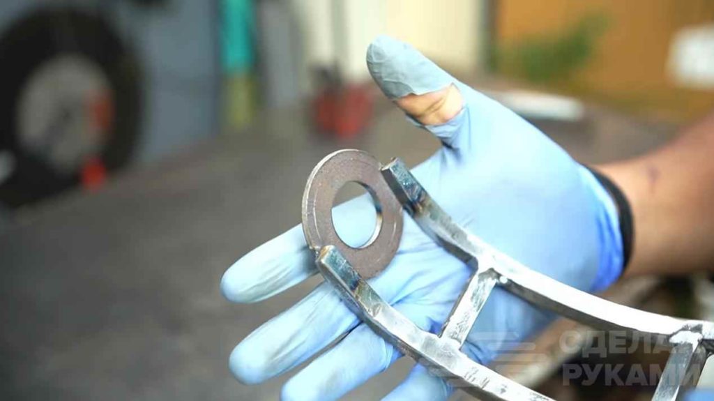 Далее отрезаем три небольших кусочка квадратного прутка. Все детали свариваем вместе. Сварные швы зачищаем болгаркой.