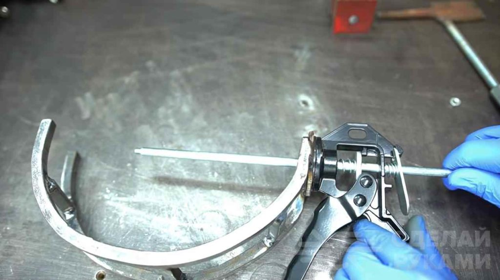 К раме струбцины автор приваривает металлическую шайбу, чтобы можно было соединить ее с рукояткой пистолета для герметика. Раму струбцины крепим к рукоятке. Возвращаем на свое место курок пистолета.